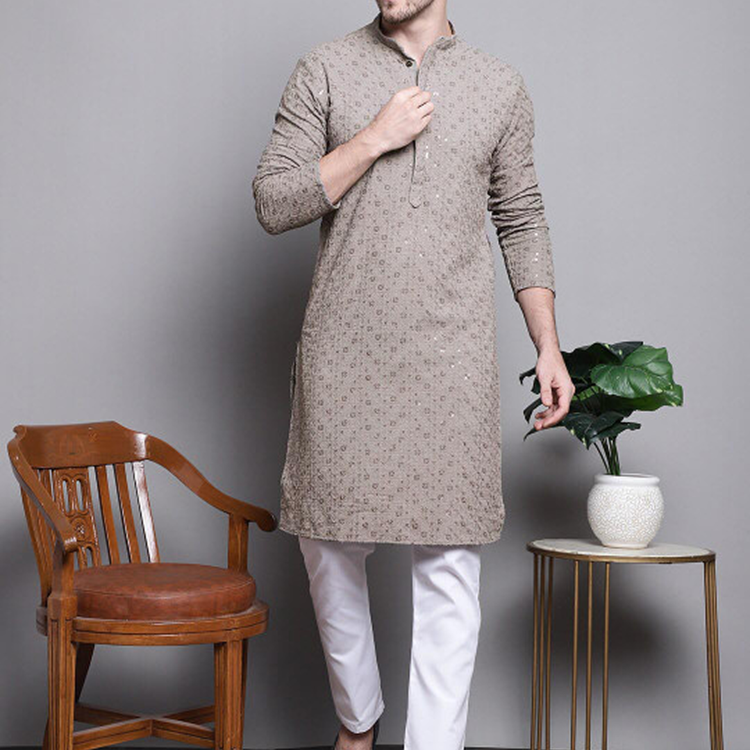 | Crafted with shimmering silk fabric and traditional brocade motifs, the Golden Aura Brocade Kurta brings opulence to every celebration. The smooth lining and structured fit offer both comfort and royal charm, making it ideal for weddings and festive evenings. |
